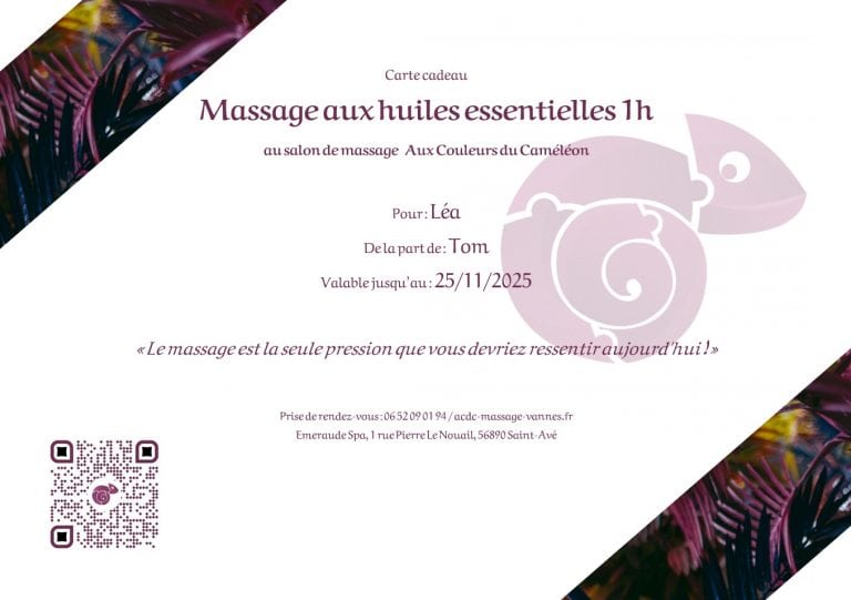 Bons de réduction et bons cadeau massage sont valables pour une durée de 3 mois à compter de l’achat. Ils sont valables à mon salon de massage de Saint-Avé, à quelques minutes du centre de Vannes.